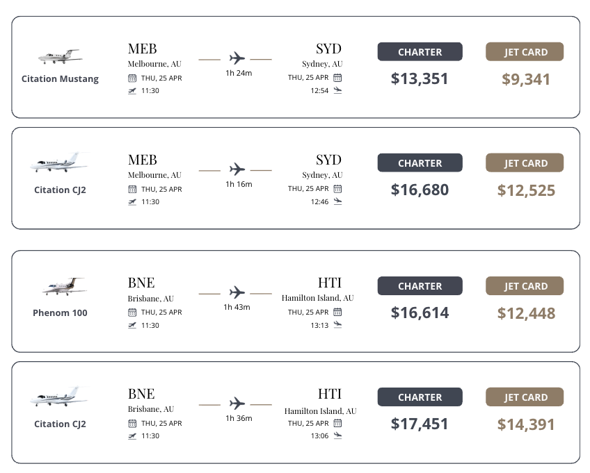 Fly on your terms across the East Coast of Australia with our private jet card. Access exclusive rates with just 48 hours’ notice. Enjoy the freedom and convenience of private travel, tailored for your busy lifestyle.